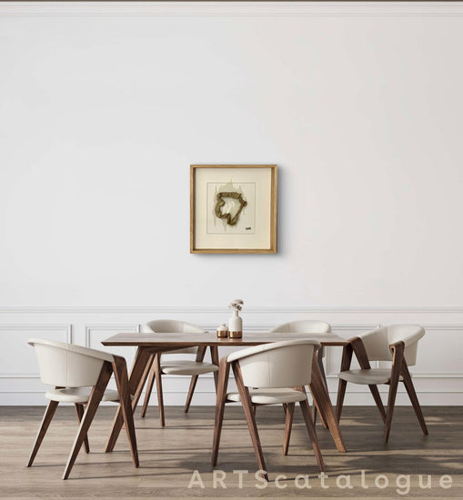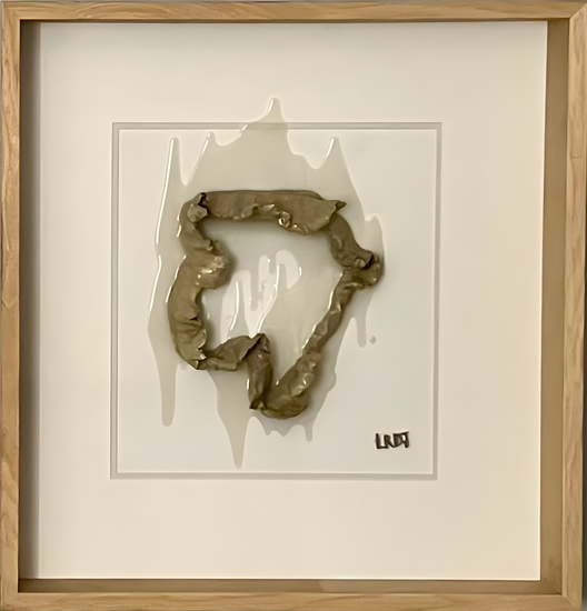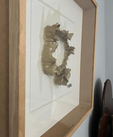 Abstract clay sculpture framed behind glass in a wooden box frame. The piece is available individually or as part of a body of work forming part of a corporate, tranquillity themed, art range.