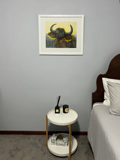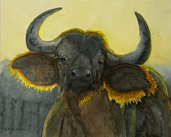Watercolour of Buffalo head with evening sun behind its head. Framed.