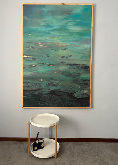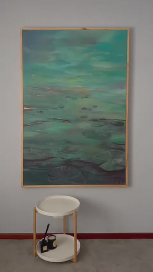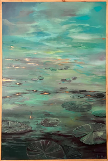 Acrylic on canvas. A dreamy composition with copper reflection highlights of a misty lilypond.