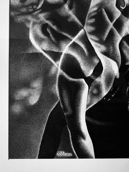 Intricately detailed black and white ink and pen crosshatch on paper of the back of a nude female body with medium length blond hair.