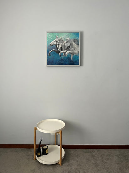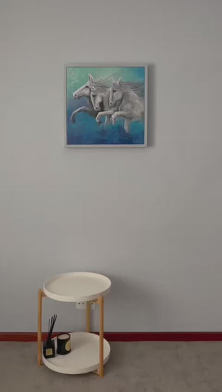 Acrylic on canvas. Three white horses galloping through a blue maze of colour.